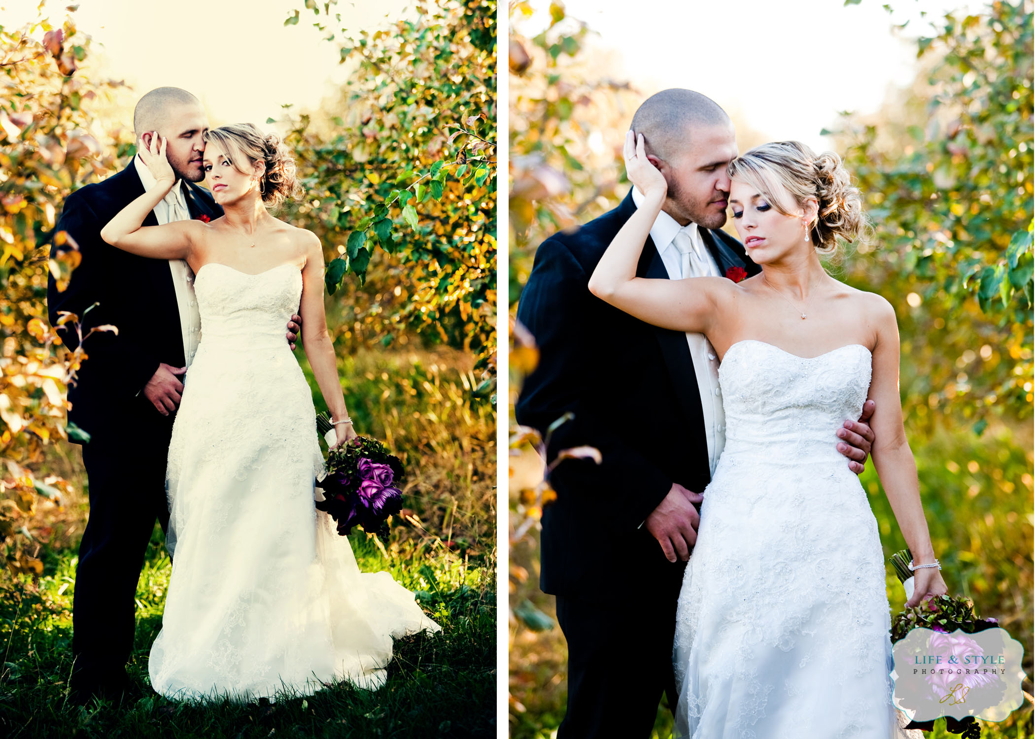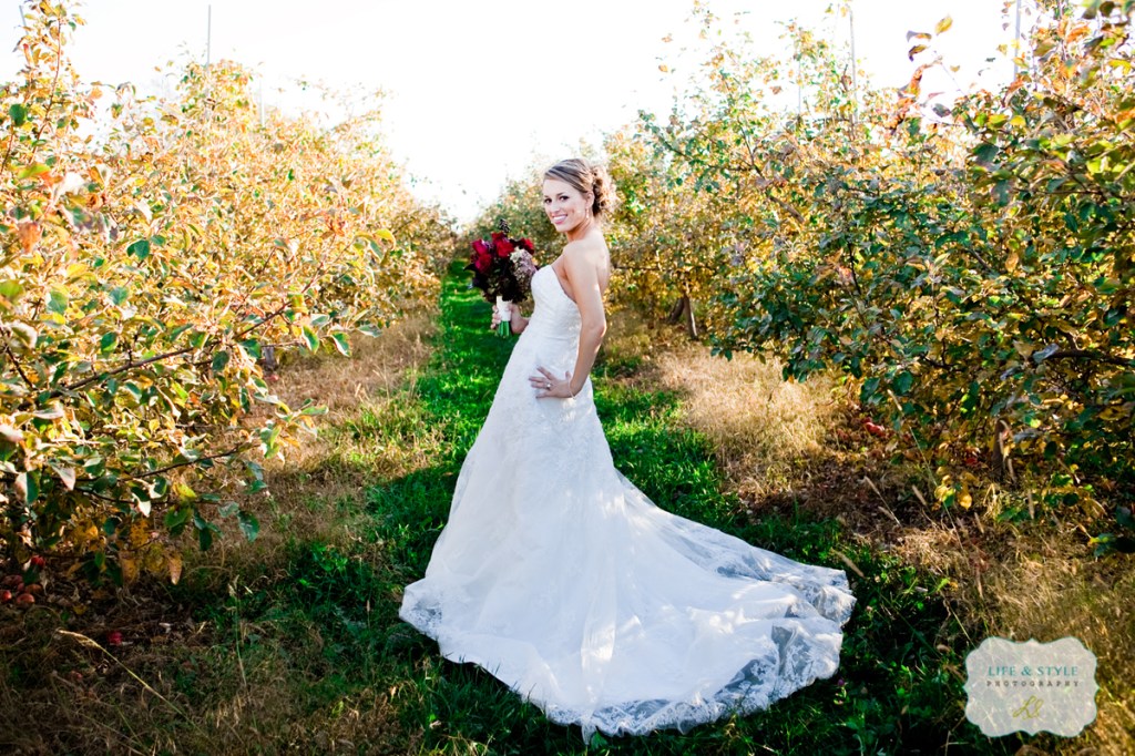 After  the ceremony, we hopped on a bus and went to the apple orchard.  I was still concerned with the sun, but Jared didn’t have a care in the world. Any time I would ask him what he thought, he’d say “It’s up to you…I’m just here to get married and eat chicken.”  Brent and I scouted this apple orchard the morning of the wedding.  The sun was in a different spot then, but somehow it worked when we returned at around 4:30 p.m.  I love this first shot of Heather.